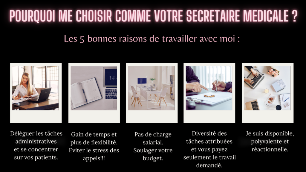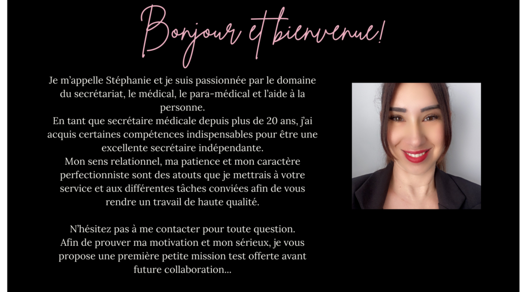 Bienvenue dans mon univers ! Je suis votre secrétaire médicale indépendante, prête à alléger votre quotidien. Que ce soit pour gérer vos tâches administratives, votre standard téléphonique, vos prises de rendez-vous, la frappe de comptes-rendus ou la gestion de votre boite mail, je suis là pour vous soutenir. Mon expérience est à votre service pour vous permettre de vous concentrer sur ce que vous faites le mieux, votre métier. Ensemble, simplifions votre vie professionnelle et faisons briller votre activité!